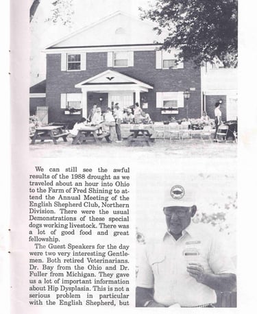 In the 1970's and 80's, Fred Shininger became one of the best known names in the English Shepherd and stock dog world. Through this affiliation, Dad became friends with EG Emanuel, from Butler, IN, who founded the National Stock Dog Registry and the International English Shepherd Registry. Together, along with a few other dedicated breeders, they strove to advance and improve the English Shepherd breed. The Shininger farm was featured in the National Stock Dog Magazine, hosted and attended annual meetings for the English Shepherd Club, and we placed English Shepherd puppies all over the Midwest. I even remember traveling to the Toledo airport with Mom to air ship puppies to farming families across the country.